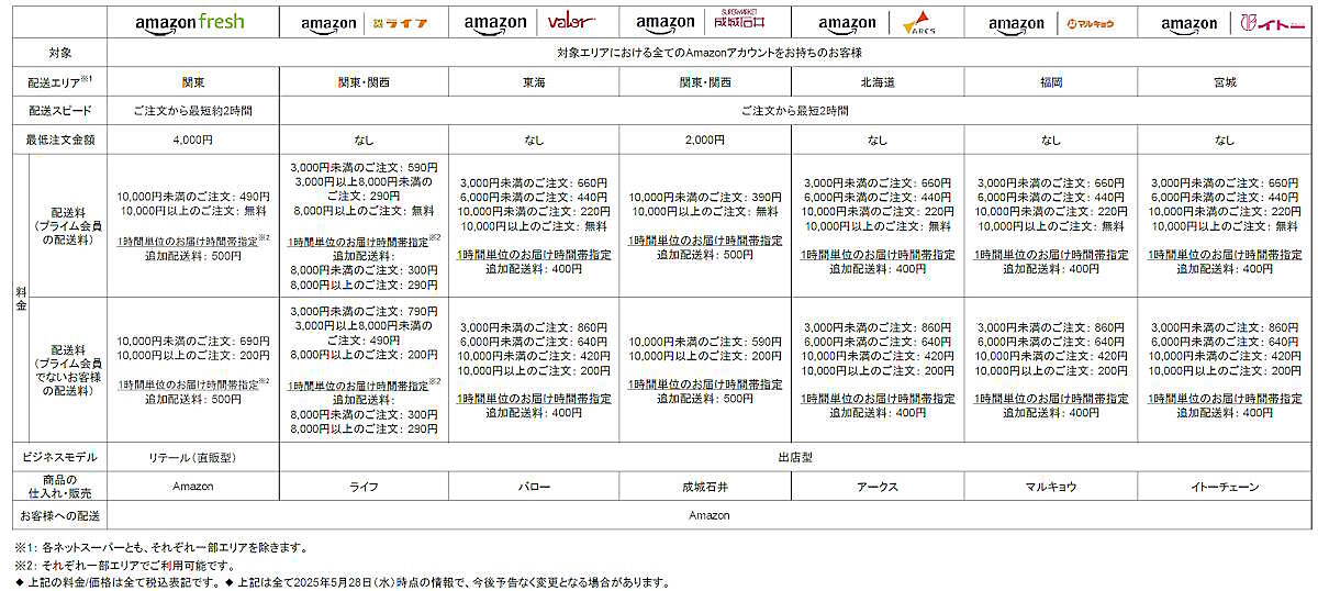 Amazonは、プライム会員向けサービスとして、東京・神奈川・千葉の一部エリアで直営ネットスーパーの「Amazonフレッシュ」を展開しているが、食品スーパー企業とは次のように協業している。