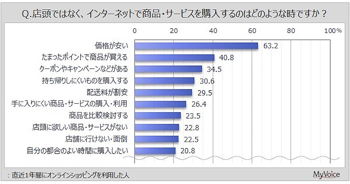 直近1年間にオンラインショッピングを利用した人に、店頭ではなくオンラインショッピングで購入する場面を聞いたところ、最も多かったのは「価格が安い」で63.2%、続いて「たまったポイントで商品が買える」が40.8%、「クーポンやキャンペーンなどがある」が34.5%、「持ち帰りしにくいものを購入する」が30.6%だった。