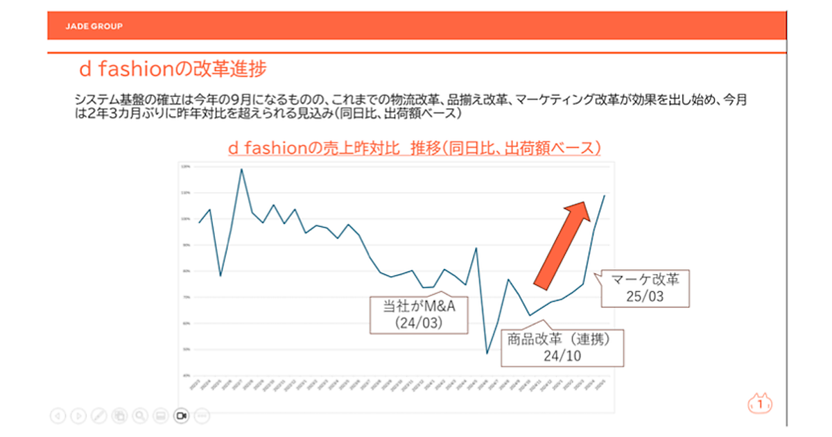 ジェイドグループは2024年3月にマガシークを子会社化。マガシークが運営するECモール「MAGASEEK」は株式を取得した段階で「d fashion」の取扱高の半分程度となり、「d fashion」の売り上げも下落傾向にあった。2022年3月以降、「d fashion」は前年同月比割れが常態化。2023年1月以降は一度も前年同月比を上回ることがなかったという。 ジェイドグループでは経営改革を進めるために2024年6月から物流統合と商品連携の準備に着手。ただ、組織統合に伴う混乱なども生じ、前年同月比をさらに割ってしまう月も続いた。