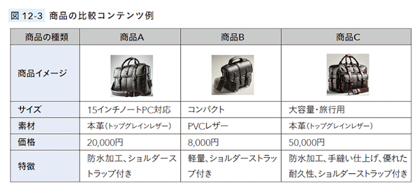 商品ページで離脱する理由の多くは「思っていた商品と違った」なので、検索結果画面に戻ることなく「もっとピッタリの商品」を提案できるとよいわけです。その一例が「商品比較」です(図12-3)。類似商品それぞれの違いを一覧化して各商品にリンクします。これを見れば、自分が選ぶべきなのはどの商品なのかが分かりやすくなります。