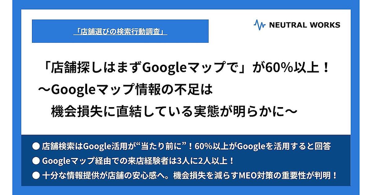 SEO対策やMEO対策サービスを展開するニュートラルワークスは5月30日、店舗探しの際の検索行動についての調査結果を公表した。それによると、店舗探しは口コミサイトを抑え、「Googleマップ」「Google検索」が活用されている。