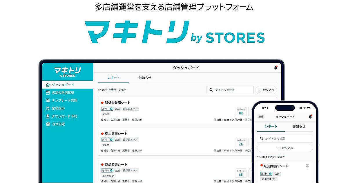 STORESは5月30日、リアル店舗を多店舗展開する事業者向けに本部と店舗をシームレスにつなぐ店舗管理プラットフォーム「マキトリ by STORES」の提供を開始した。多店舗運営の業務効率化、現場オペレーションの標準化、サービス品質の安定にサポートする。本部からの業務指示や店舗からの掲示物・ルーティン業務に関する報告などを可視化し、一元管理する。