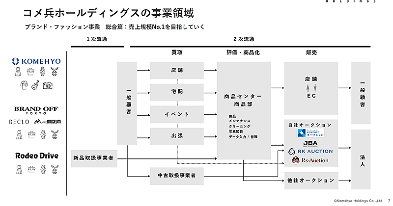 コメ兵HDの主要事業は、売上高構成比の96.1%を占めるリユースのブランド・ファッション事業だ。なかでも主軸となるのは法人・一般顧客へのリユース商品の仕入れ・販売で、「KOMEHYO(コメ兵)」「BRAND OFF(ブランドオフ)」「Rodeo Drive(ロデオドライブ)」の3ブランドを展開。その他事業では、「BtoBのオークションなどの運営」と「リユース商品の検品サービス」も提供する。