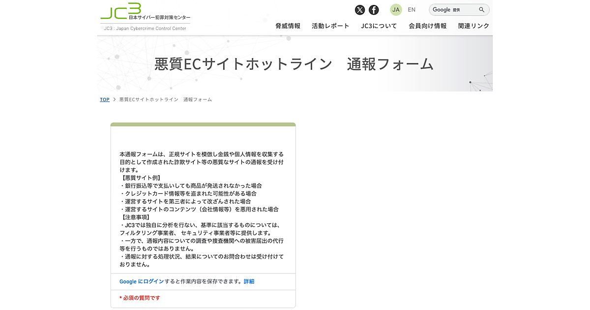 通報受付のスタートは、がこれまで一般社団法人セーファーインターネット協会が実施していた「悪質ECサイトホットライン」をJC3が引き継いだ。正規サイトを模倣し金銭や個人情報を収集する目的で作成された詐欺サイトといった悪質なサイトに関する通報を受け付ける。悪質サイトの例は次の通りとしている。