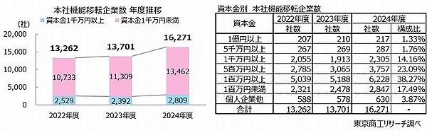 規模別では、資本金1000万円以上が前年度比17.4%増の2809社で3年ぶりに増加。資本金1000万円未満は同19.0%増の1万3462社と3年連続で増えた。前年度は小・零細企業の本社移転が件数を押し上げたが、2024年度は中堅規模以上の本社移転も増加した。