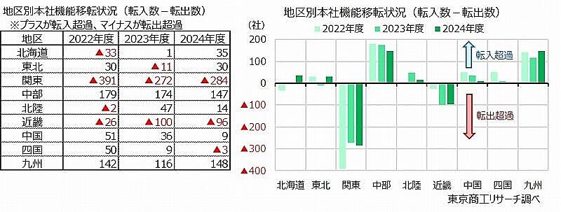 転出超過だったのは、関東、近畿、四国の3地区。関東がマイナス284社と圧倒的に多かった。関東から地方への転出に歯止めが掛からず、4年連続で転出超過となった。