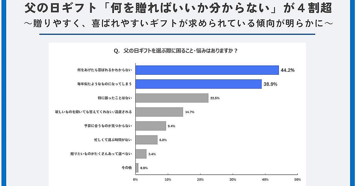 父の日のギフトを選ぶ際に困ること・悩みがあるかを聞いたところ、「何をあげたら喜ばれるかわからない」が最も多く、44.2%となった。続いて「毎年似たようなものになってしまう」 が38.9%だった。