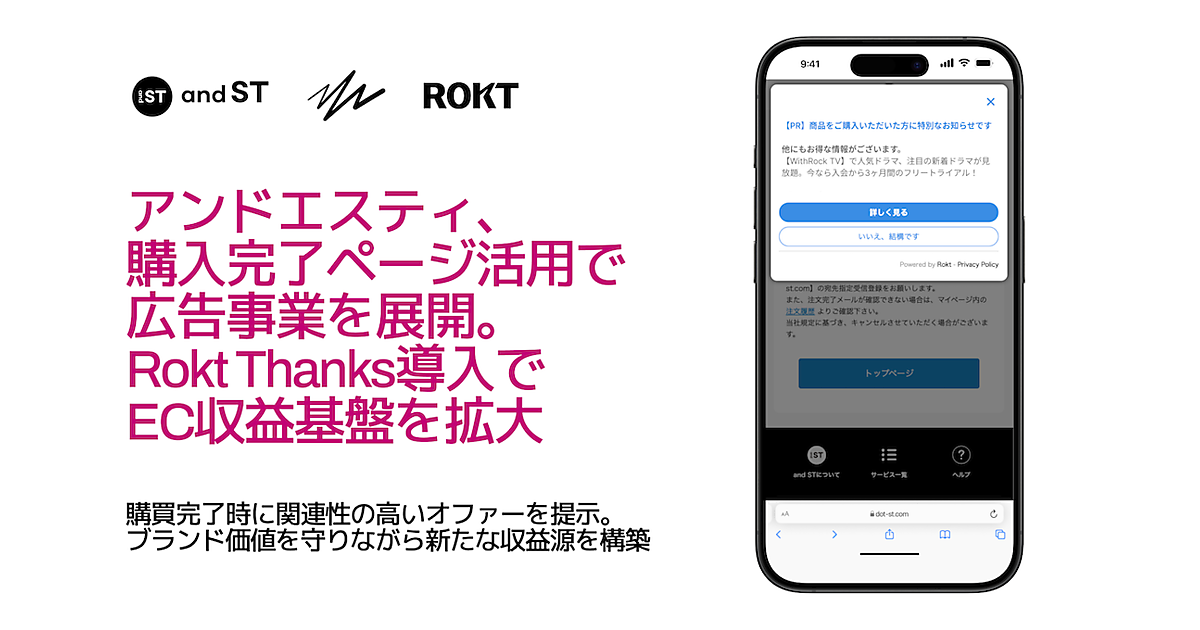 ECサイトで買い物が完了した直後の「購入完了ページ(購入確認画面)」上で、消費者にとって関連性の高い広告を提示できるようになる。導入により「and ST」では、ファーストパーティデータとRoktのAI・機械学習技術を活用し、顧客が購入を完了した直後のタイミングで、1人ひとりに関連性の高い外部広告主からのオファーを提示する。