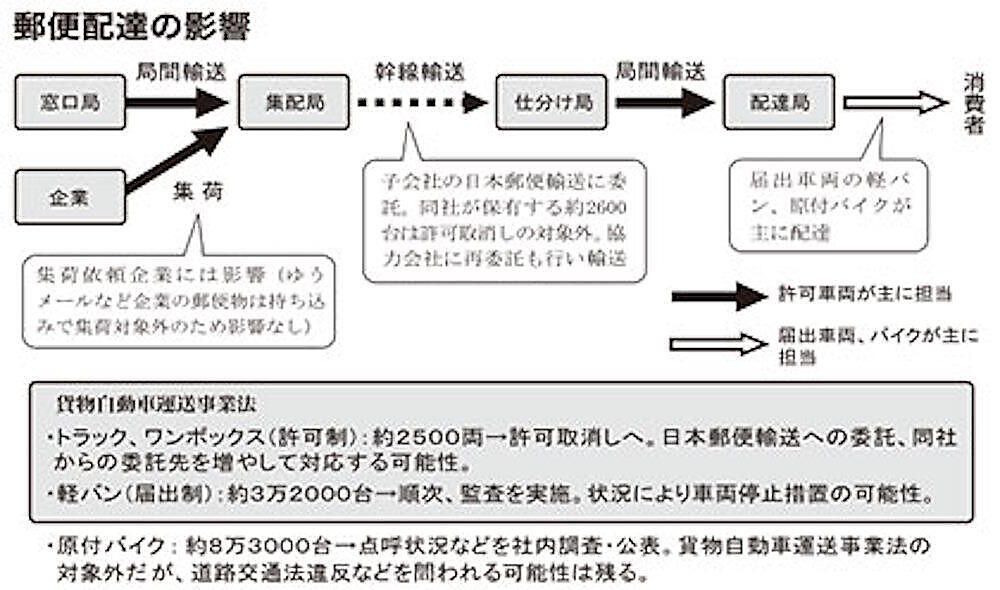 日本郵便は、「ゆうパック」について、「運べなくなることはない。サービス品質も変わらない」とする。だが、近距離輸送を担う車両が許可取消しになれば、少なくとも5年間は使えない。配送遅延、コスト増、品質低下の懸念がある。外部委託の増加に伴う競争環境など業界の構図も変わる。