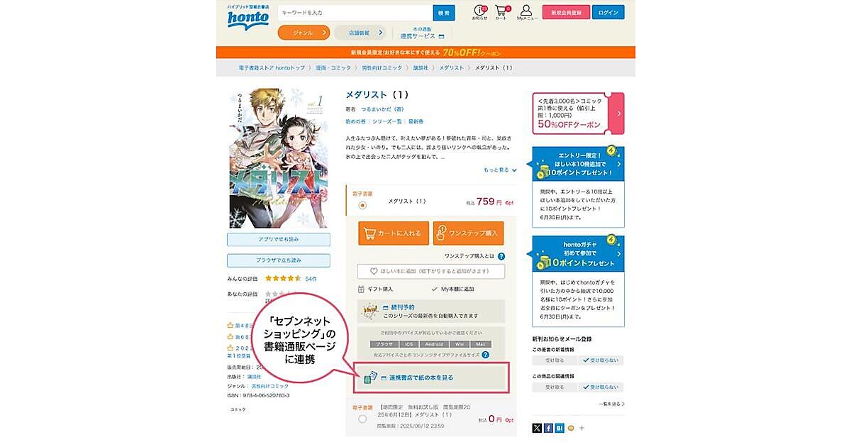 2025年度内に「honto」と「セブンネットショッピング」を連携、書籍通販サービスがシームレスに利用できるようにする。「honto」の各商品ページに「セブンネットショッピング」への遷移ボタンを設置、利用者はそこで本を注文し、全国の「セブン-イレブン」約2万2000店舗で受け取れるようにする。