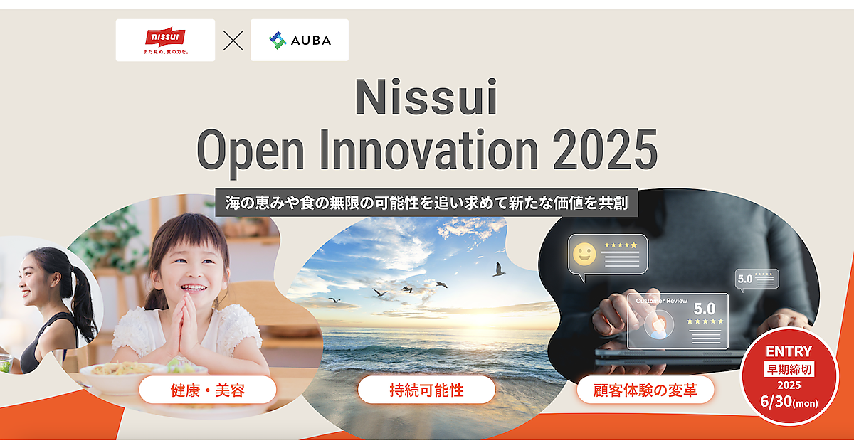 ニッスイは6月16日、中期経営計画「GOOD FOODS Recipe2」(2025~27年度)で掲げる「新規事業・事業境界領域の開拓」に向け、食の可能性を引き出し新しい価値を共創することを目的に、パートナー企業および事業アイデアを募集するプログラム「Nissui Open Innovation 2025」を開始した。「健康・美容」「持続可能性」「顧客体験の変革」の3つをテーマに、6月16日から7月31日の期間に募集する。