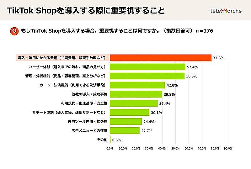 導入する場合に重視することは、「導入・運用にかかる費用(初期費用、販売手数料など)」が最多で77.3%、続いて「ユーザー体験(購入までの流れ、商品の見せ方)」が57.4%、「管理・分析機能(商品・顧客管理、売上分析など)」が56.8%だった。