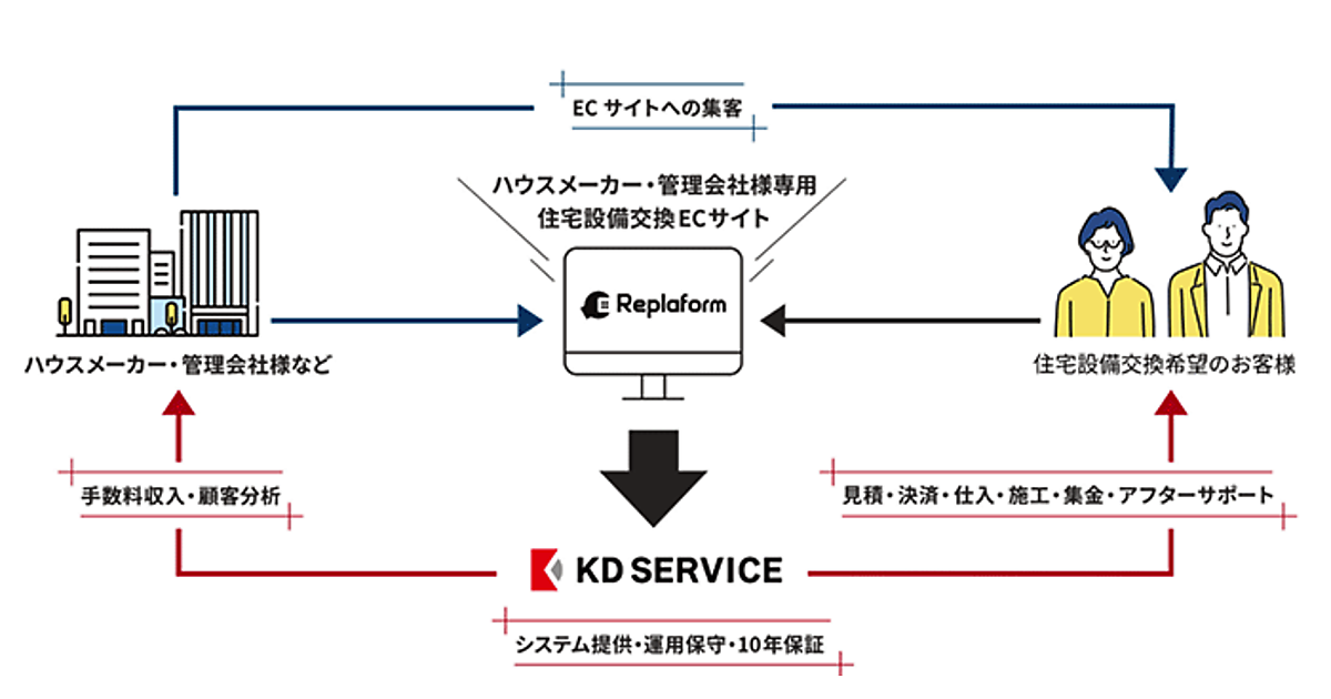 交換できるくんの100%子会社であるKDサービスが、見積から注文受付、商品仕入れ、施工手配までを一括で担う。住宅設備ECの開設・運用コストを従来比で大幅に低減し、新規事業参入を後押しするとしている。