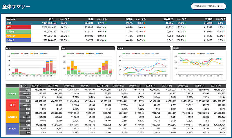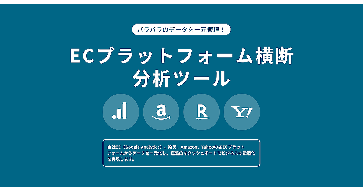 「ECプラットフォーム横断分析ツール」は、「Shopify」(Google Analytics)、「楽天市場」「Amazon」「Yahoo!ショッピング」など複数のECプラットフォームのデータを統合、統一したダッシュボード上で分析するツール。さまざまなプラットフォームのパフォーマンスを一元的に把握できるようにし、マーケティングキャンペーンの効果測定、売上傾向の分析、顧客エンゲージメントの評価など、あらゆるビジネスニーズに対応する。