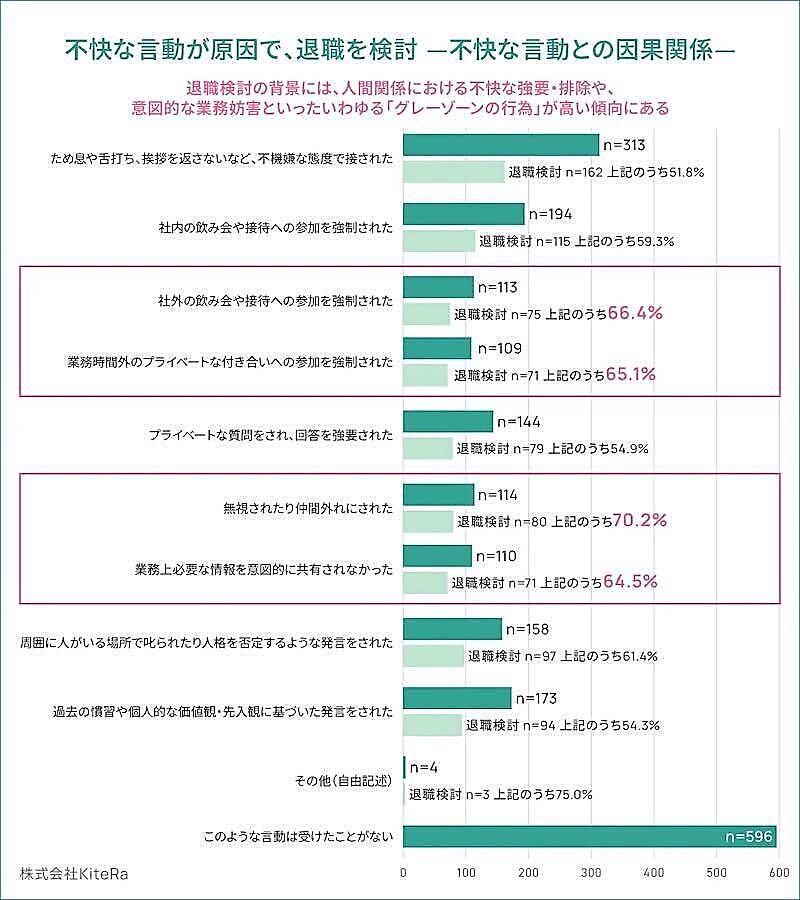 不快な言動が原因で退職を検討した人が受けた言動との因果関係を深掘りしたところ、退職検討につながる不快な言動は「無視されたり仲間外れにされた」が最多で70.2%、続いて「社外の飲み会や接待への参加を強制された」が66.4%、「業務時間外のプライベートな付き合いへの参加を強制された」が65.1%だった。