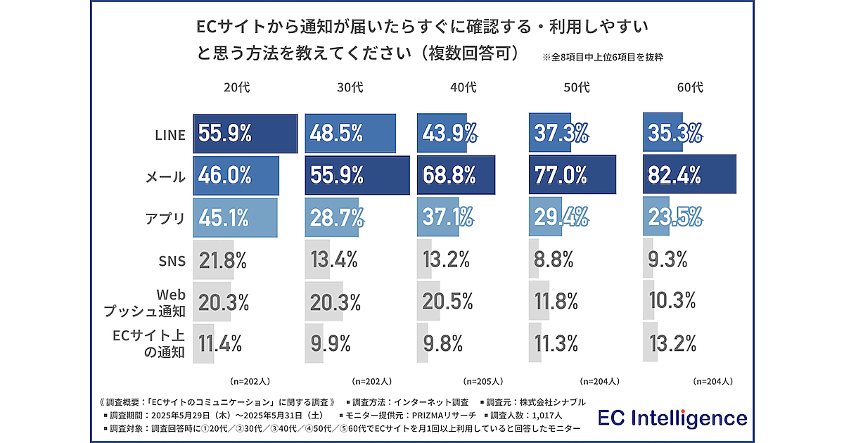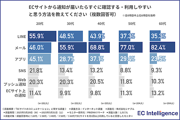 通知チャネルとして最も利用されているのは、20歳代は「LINE」が最多、30〜60歳代では「メール」がトップ。50歳代以降になると「メール」の割合が7割を超えており、従来型の通知チャネルが根強く支持されている。