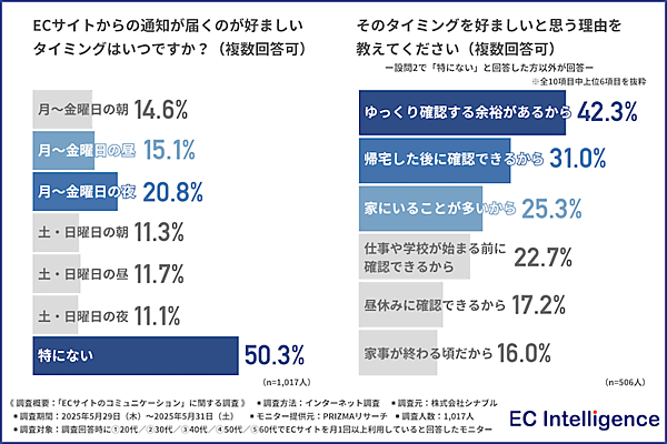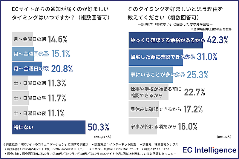 「ECサイトからの通知が届くのが好ましいタイミング」は、約半数が「特にない」と回答。「月~金曜日の夜」は約2割で、平日の帰宅後の自由時間、スマートフォンを操作する頻度が高い時間帯が通知に適しているようだ。