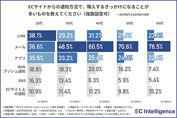 「ECサイトからの通知方法で、購入するきっかけになることが多いもの」は、年代別で次のような回答結果となった。