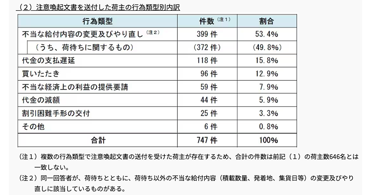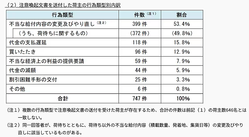 また、独占禁止法上の問題につながるおそれのある行為を行った荷主646人に対し、具体的な懸念事項を明示した注意喚起文書を送付した。注意喚起を実施した荷主の上位3業種は、「協同組合」「飲食料品卸売業」「建築材料、鉱物・金属材料等卸売業」の順だった。