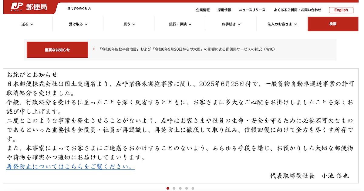 日本郵便で「今回の行政処分などを厳粛に受け止め、運送事業者として、確実な点呼の実施をはじめ、運行の安全および運転者・お客さまの安全を確保する体制構築を徹底し、信頼回復に全力で取り組む」としている。