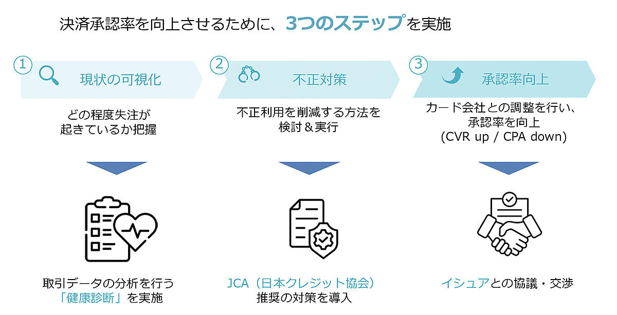 EC事業において、重要と言える決済承認率を向上させるため、YTGATEが提唱するのは ①現状の可視化 ②不正対策 ③承認率向上という3ステップだ。