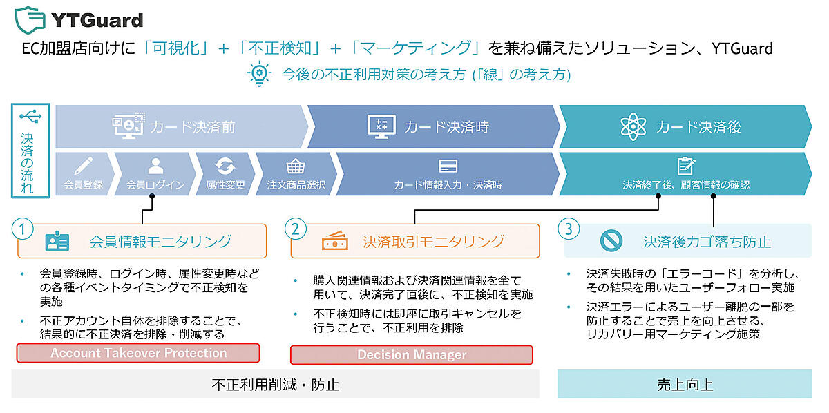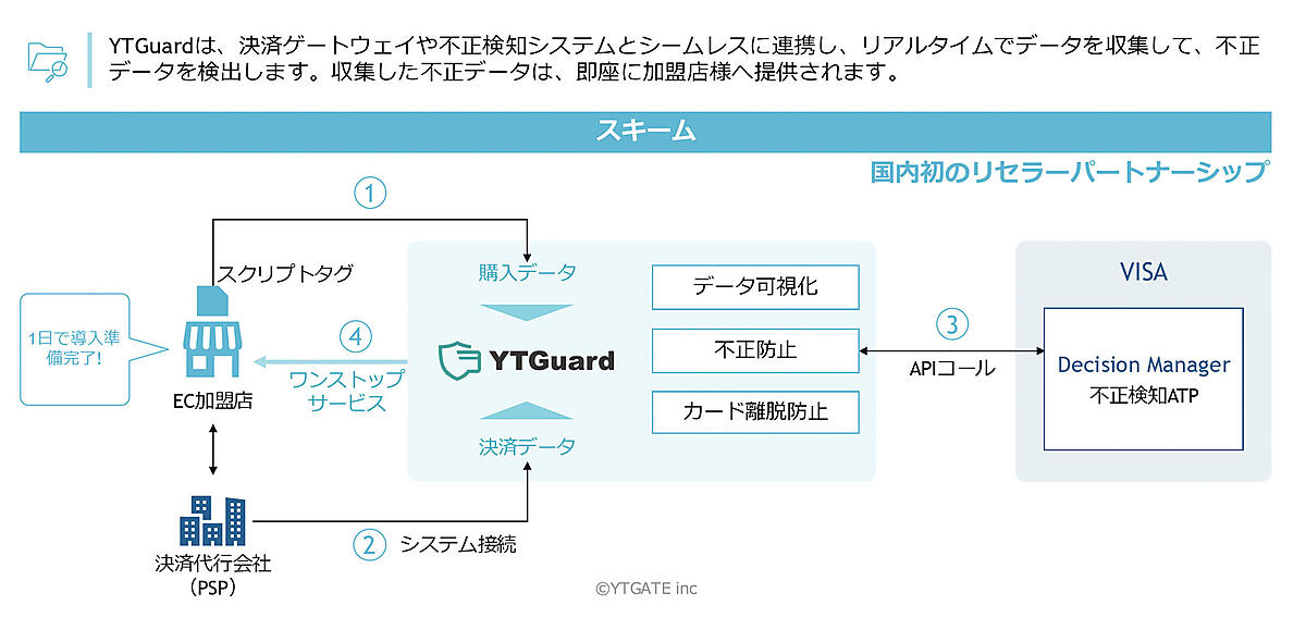 YTGATEは、VISAが提供する不正検知の「Decision Manager」や、アカウント乗っ取り対策の「Account Takeover Protection」といった高度な不正検知ソリューションにおいて国内唯一のリセラーとなっており、これらの機能とYTGATEの技術との連携で、より高度な不正検知を可能にしている。