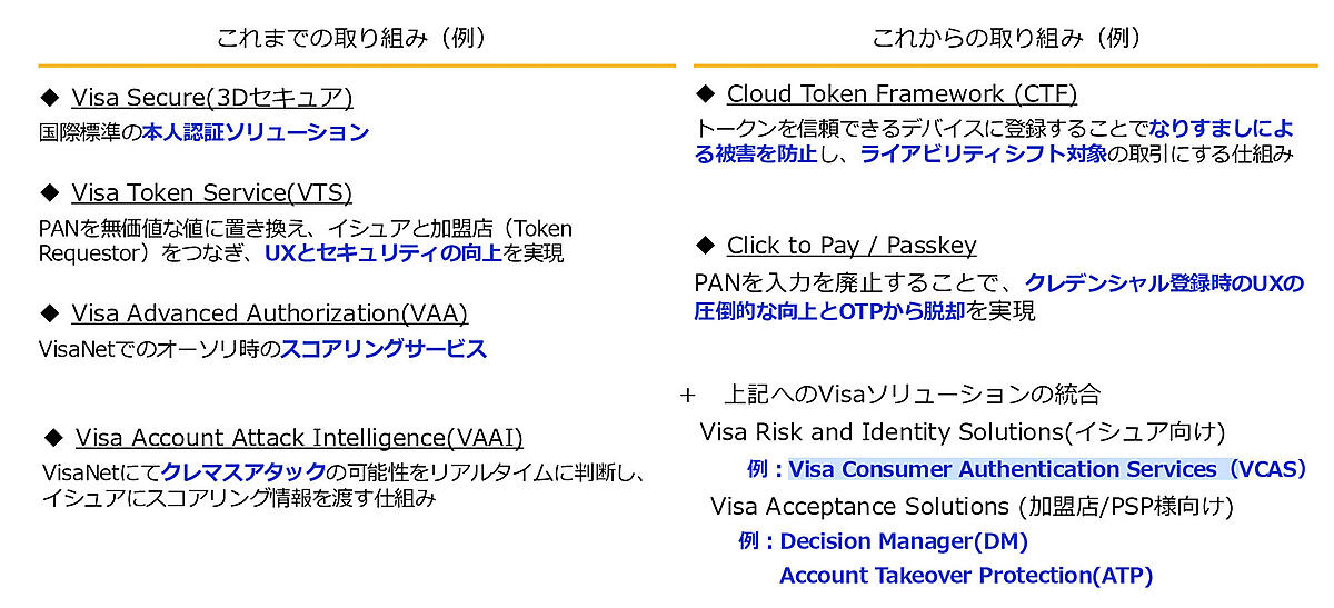 VISAでは、不正対策として国際標準の本人認証ソリューション「Visa Secure(3Dセキュア)」、PAN※1を無価値化する「Visa Token Service」、スコアリングによる不正検知機能「Visa Advanced Authorization」、さらにリアルタイムでクレマスアタック※2を判定する「Account Attack Intelligence」といった複数の取り組みをグローバルで進めている。