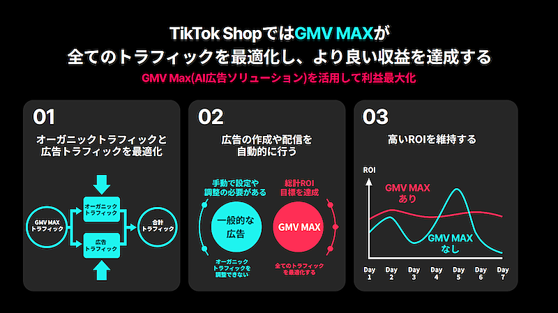 「GMV Max」は「TikTok Shop」での売上増を支援するAI広告ソリューション。オーガニックと広告の両トラフィックを横断的に最適化する。広告の作成から配信、予算管理までをシステムが自動化、出稿主のROI(投資対効果)目標達成やGMV(流通総額)の拡大に貢献するとしている。「GMV Max」の特長は次の通り。