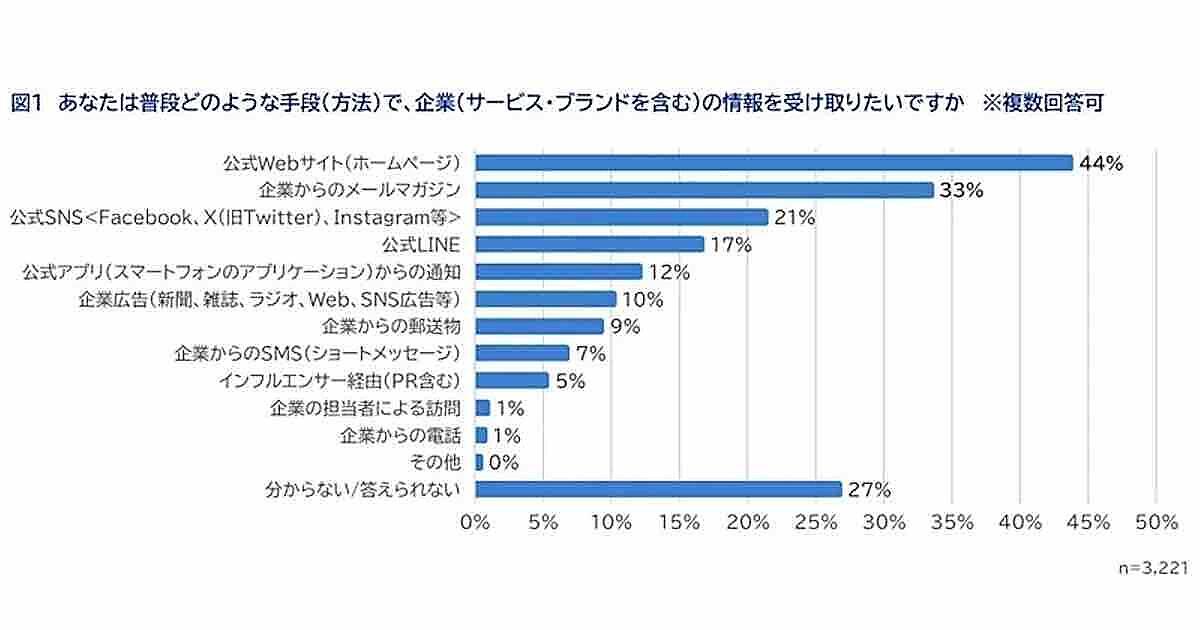 普段どのような手段(方法)で企業(サービス・ブランドを含む)の情報を受け取りたいかを聞いたところ、最多は「公式Webサイト(ホームページ)」で44%。続いて「企業からのメールマガジン」が33%、「公式SNS<Facebook、X(旧Twitter)、Instagramなど>」が21%、「公式LINE」が17%。一方で「わからない/答えられない」は27%だった。