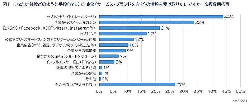 44%が企業の情報を「公式Webサイト」で受け取りたいと回答