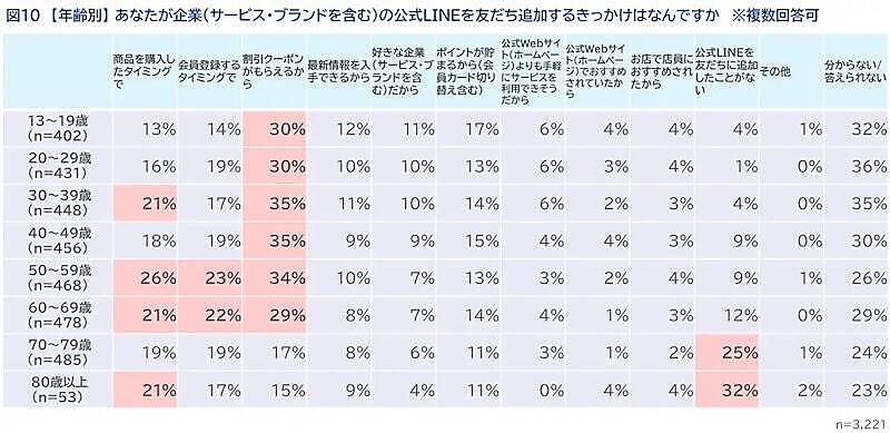 年齢別に見ると、10〜60歳代では「割引クーポン」が主な動機の一方で、70歳代以上では「公式LINEを友だちに追加したことがない」が25%を超えており、LINEを使用した企業との接点は他世代と比べて少ない。