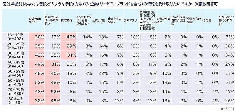 年齢別に見ると、どの年代も「公式Webサイト」と「企業からのメール」が高い割合を占めており、基本的な情報源として定着している。