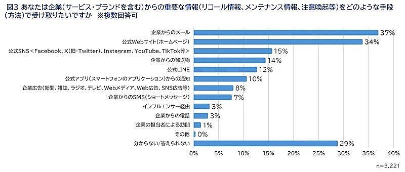 企業からのリコール情報、メンテナンス情報、注意喚起といった重要な情報をどのような手段で受け取りたいかを聞いたところ、「企業からのメール」が最多で37%、続いて「公式Webサイト」が34%、「公式SNS」が15%、「企業からの郵送物」が14%。