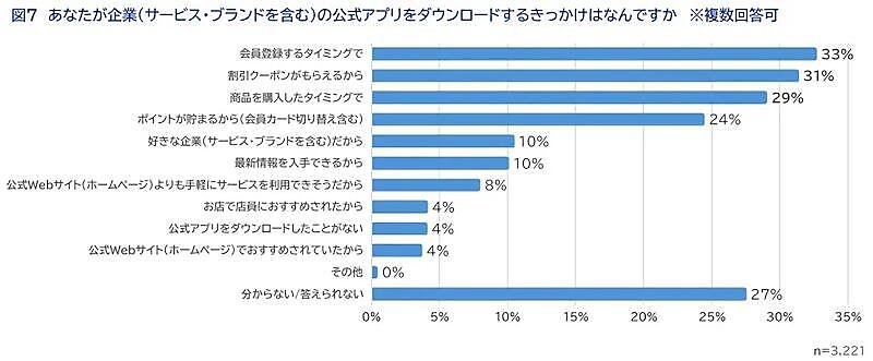 公式アプリをダウンロードするきっかけは、最多が「会員登録するタイミングで」で33%、「割引クーポンがもらえるから」が31%、「商品を購入したタイミングで」が29%で続いた。