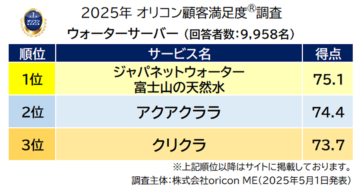 オリコンの子会社で顧客満足度調査を実施するoricon ME(オリコン エムイー)はこのほど、「ウォーターサーバー」に関する満足度調査結果「オリコン顧客満足度」を発表、ジャパネットグループのジャパネットウォーターが販売する「ジャパネットウォーター 富士山の天然水」が5年連続の総合1位を獲得した。