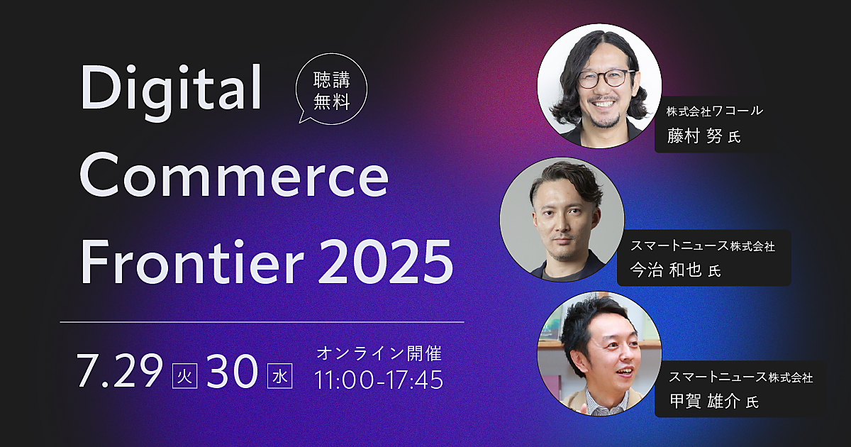 7月29日(火)+30日(水)に、デジタルコマースに関わる人必見の大型オンラインイベント「Digital Commerce Frontier 2025」を開催。ワコール、スマートニュース、ZOZO、中川政七商店、アスクル、パルコ、アシックスなど著名企業の成功事例や実践的な知見を学べるさまざまなセミナーを用意しています。リテールビジネス、BtoC-EC、BtoB-EC、メーカーECなどデジタルコマースに携わる方を対象に、AIやリテールテックなどの最新トレンド、最先端テクノロジー活用、事例、最新ソリューションなどを多数お届け。視聴はすべて無料です!(事前登録制)。オンラインで全国から参加いただけます。まだお申し込みをしていない人のために、編集部がおすすめ講演の見どころをご紹介します。