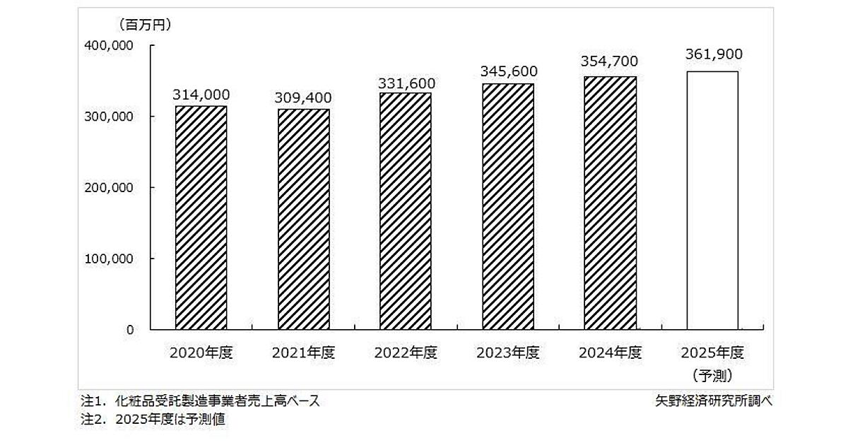 矢野経済研究所が7月4日に発表した「化粧品受託製造市場に関する調査」によると、2025年度の化粧品受託製造市場は、前年度比2.0%増の3619億円になると予測した。通販やECを中心としたファブレスメーカーが市場拡大をけん引するとしている。