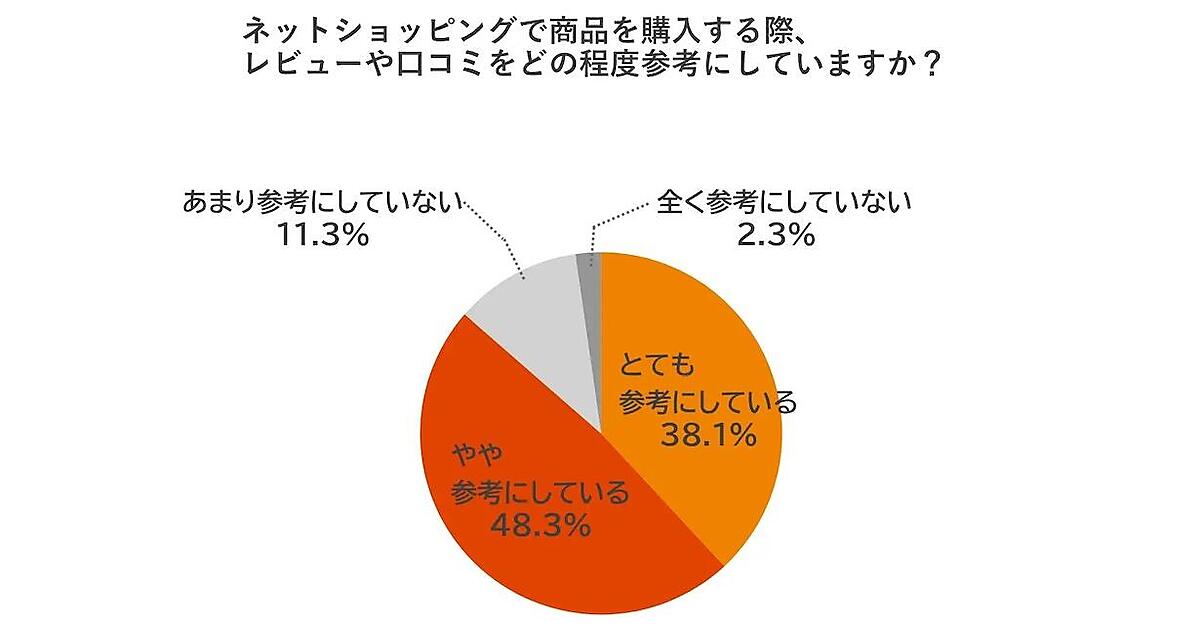ネットショッピングをする際に、レビューや口コミをどの程度参考にしているかを聞いたところ、「とても参考にしている」が38.1%、「やや参考にしている」が48.3%で、合計すると約9割が「参考にしている」と回答した。ラクスは「レビューや口コミはネットショッピングにおける商品の比較・判断材料として大きな影響力がある」と解説している。