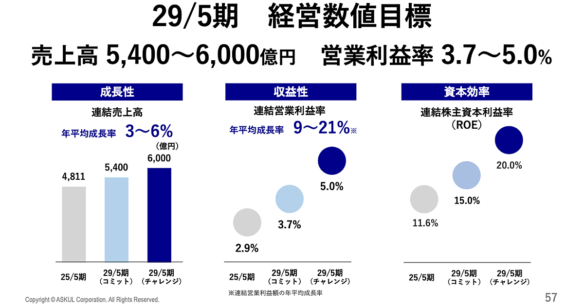 アスクルはこのほど、2029年5月期までの新中期経営計画を発表、目標数値として2029年5月期には売上高5400〜6000億円、営業利益率じゃ3.7%〜5.0%を掲げた。BtoB市場でのPayPayとの協業、対人サービス業種の強化などを通じて目標達成をめざす。