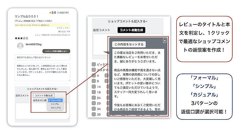 「AIショップコメント」は、レビュー返信コメントの文面案をAIが自動で生成する機能。投稿されたレビューのタイトルやコメントのテキストを自動で判定し、各レビューの内容に沿った返信コメント案を作成する。「フォーマル」「シンプル」「カジュアル」の3パターンのテイストで返信案を作成可能。ポジティブレビューとネガティブレビューなどでAI返信の使い分けもできる。