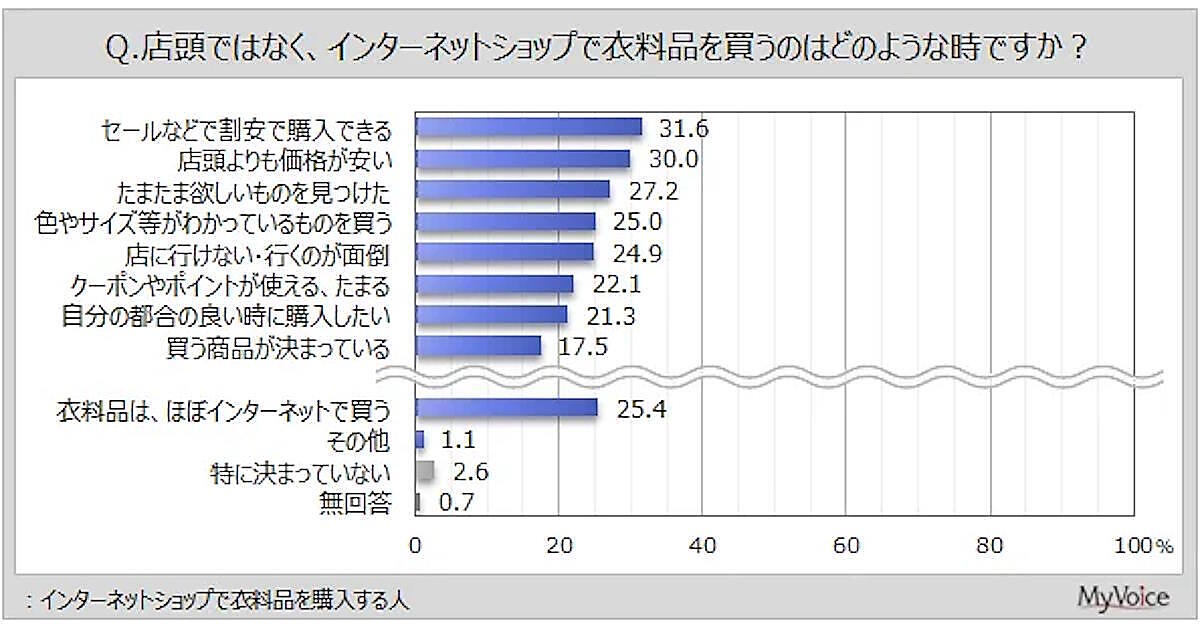 マイボイスコムが実施した衣料品の購入に関するインターネット調査によると、4割弱が衣料品の購入場所は「インターネット」と回答した。ECを選ぶ理由は「セールなどで割安で購入できる」「店頭よりも価格が安い」などがあがった。