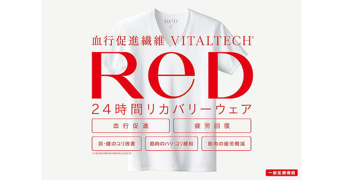 「ReD」は一般医療機器区分「家庭用遠赤外線血行促進用衣」として、インナーウェアやスリープウェアなどを展開するブランド。遠赤外線の血行促進作用により「血行促進」「疲労回復」「肩・腰のコリ改善」「筋肉のハリ・コリ緩和」「筋肉の疲労軽減」の5つの効果が期待できるとしている。