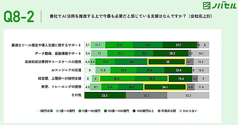 会社の売上規模別に見ると、1000億円以上の売上の会社では「教育・トレーニングの提供」と「具体的成功事例やユースケースの提供」が多く、10億~100億円未満、100億~1000億円未満の会社では、共通して「経営層・上層部への説明支援」が求められる傾向があった。