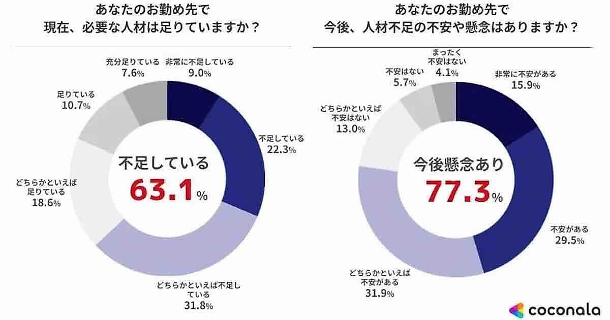 ココナラが全国の企業に勤務する5000人を対象に実施した「2025年 国内企業における人材不足実態調査」によると、国内企業の6割以上が現在、人材不足を感じており、約8割が将来の人手不足を不安視していることがわかった。特に「専門性が必要な分野」が懸念されており、最も不足している職種はIT系だった。