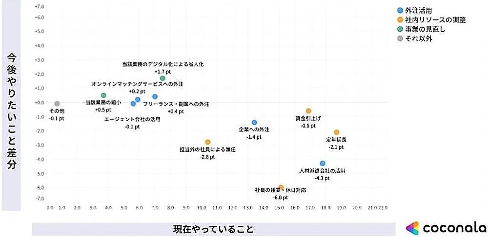 現在行っている人材不足対策と今後やりたいことの差分を抽出したところ、“現在はあまりできていないが今後取り組みたい対策”として「当該業務のデジタル化による省人化」「オンラインマッチングサービスへの外注」「フリーランス・副業への外注」「エージェント会社の活用」があがっていることがわかった。ココナラは「正社員採用・活用が十分に進んでいない中、DXによる省人化や外部人材の活用をめざす企業が増えている」と考察している。
