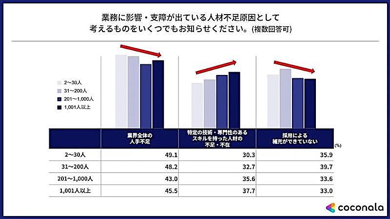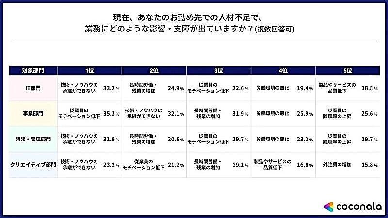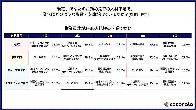 ココナラは、2〜30人規模の企業では「『技術・ノウハウの承継ができない』『製品やサービスの品質低下』なども大企業と比較して相対的に高かった。同規模の企業においては、事業運営や売り上げの低下に影響が出ると考える企業が多い」と考察している。