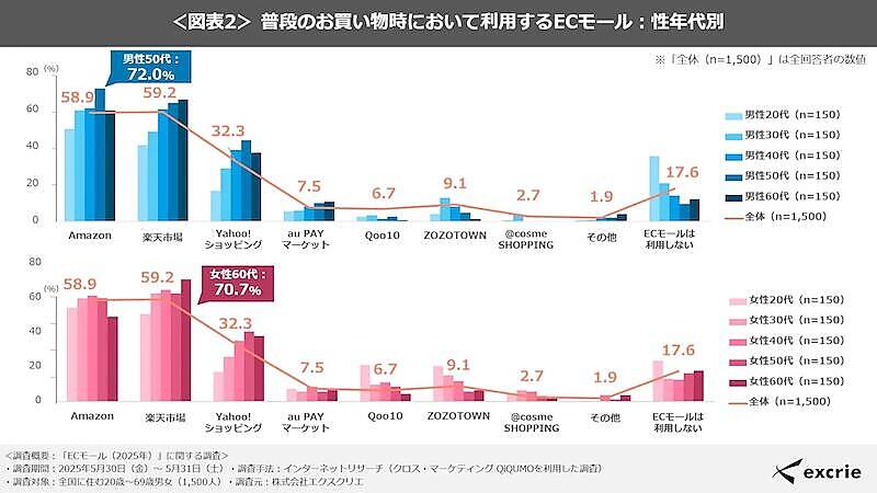 普段の買い物の際に利用するECモールを聞いたところ、最も多かったのは「楽天市場」で59.2%(前年調査比2.7ポイント増)、続いて「Amazon」が58.9%(同4.5ポイント増)だった。