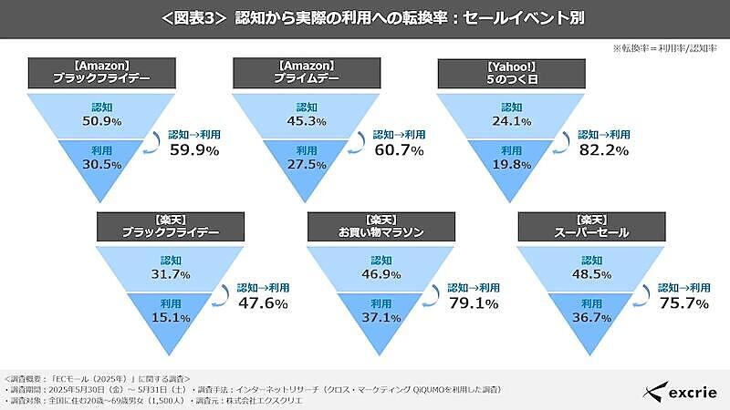 セールイベントの認知から実際の利用に至る転換率(セールイベントの利用率を、認知率で割った数値)は、最多が「Yahoo!ショッピング」の「5のつく日」で82.2%、続いて「楽天市場」の「お買い物マラソン」が79.1%、「楽天市場」の「スーパーセール」が75.7%だった。