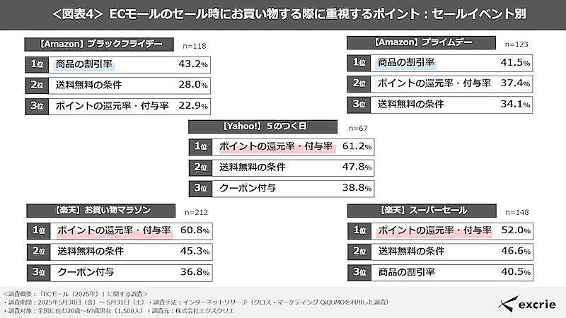 「楽天市場」の「お買い物マラソン」では60.8%、「スーパーセール」では52.0%、「Yahoo!ショッピング」の「5のつく日」では61.2%の利用者がポイントの還元率・付与率を重視している。