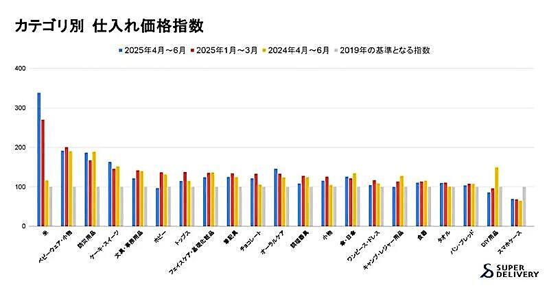 - 米:2025年1-3月に続き、仕入価格の高騰が継続。上昇トレンドは衰えず、全カテゴリ中で最大の伸び率を記録している。指数は300を超え、基準年としている2019年からは238.9%増となっている。